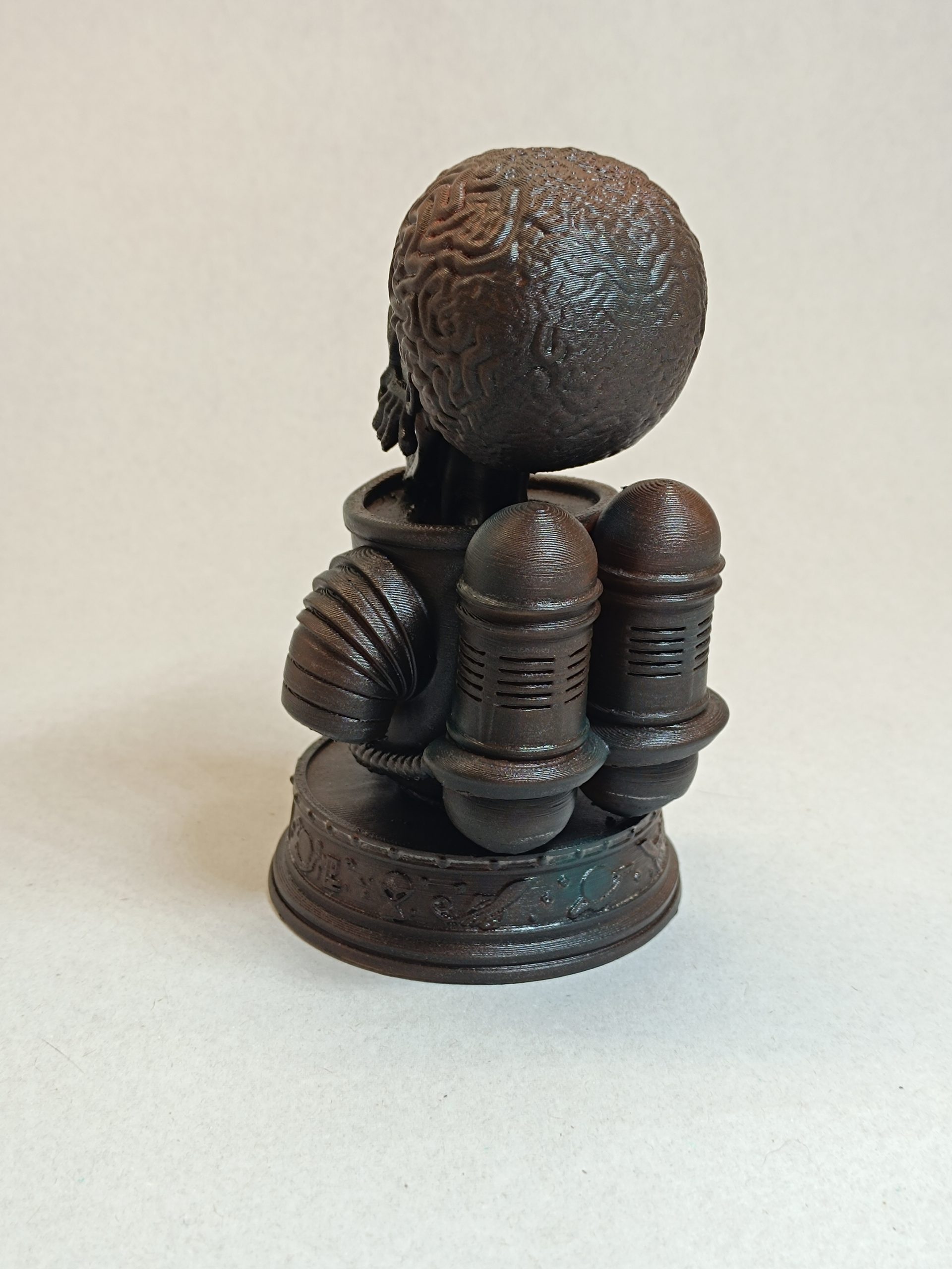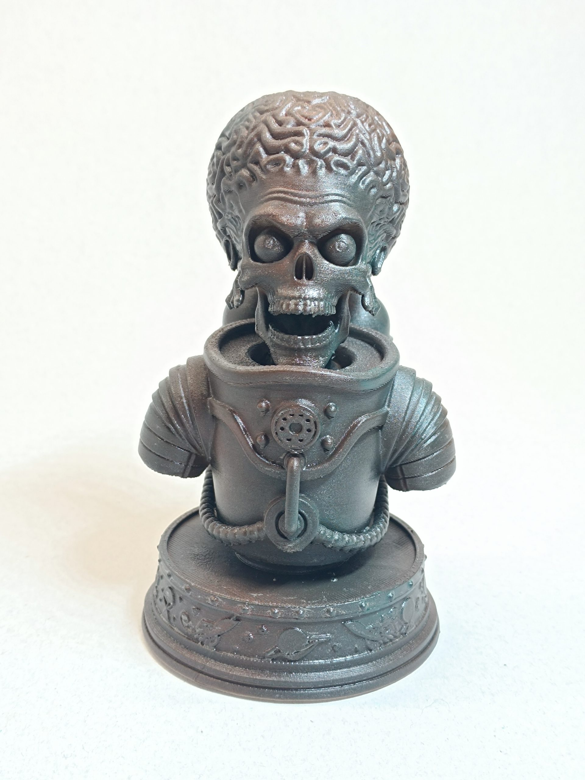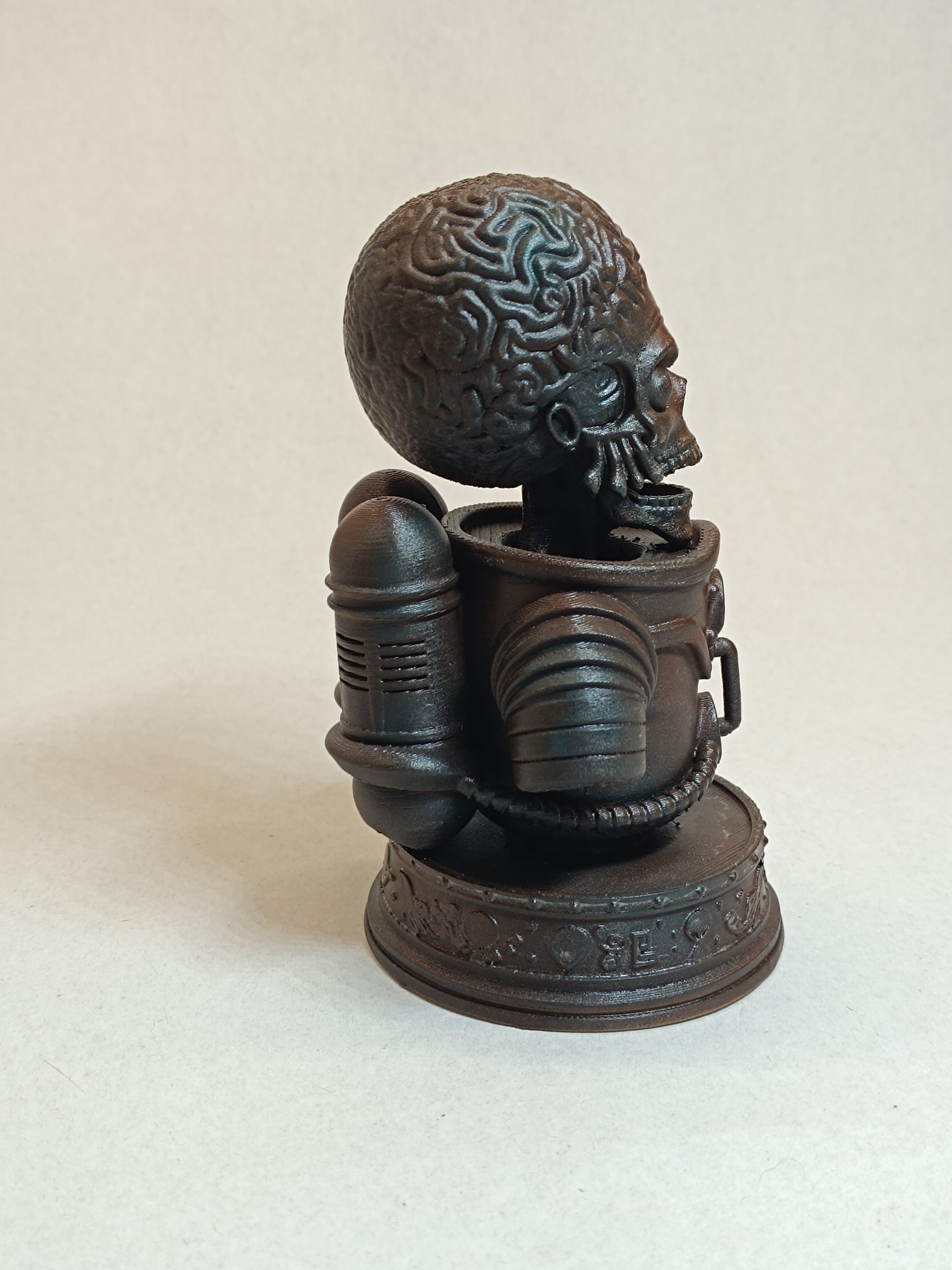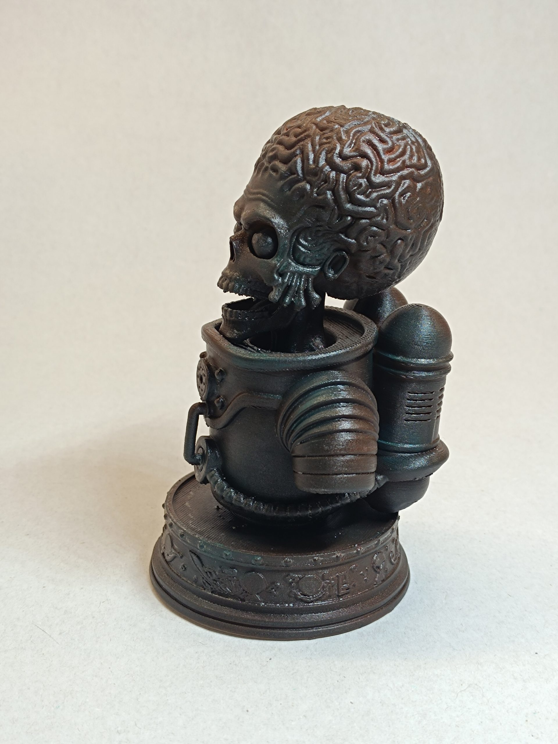 Sujet : Mars Attacks (Buste). Matière : Impression 3D. Aspect visuel : Rendu matière métal usé. Finition : Finition main, aspect brut. Dimensions : 12 cm (hauteur). Poids : 87 g. Origine : Fabrication artisanale.