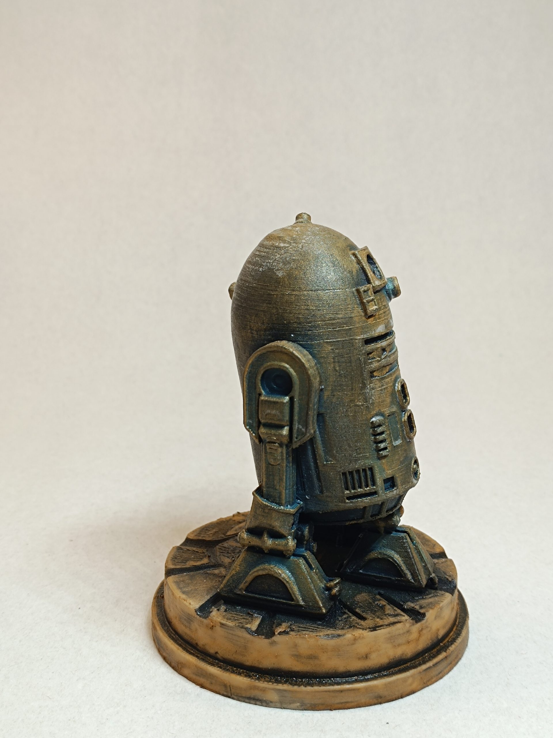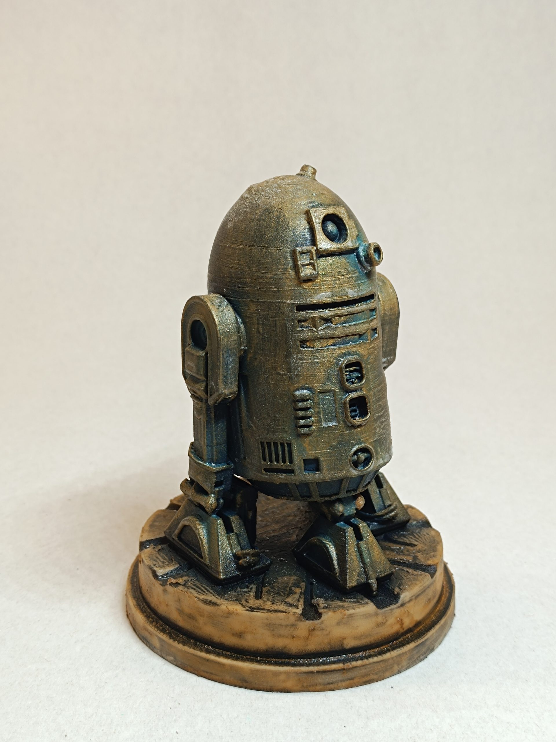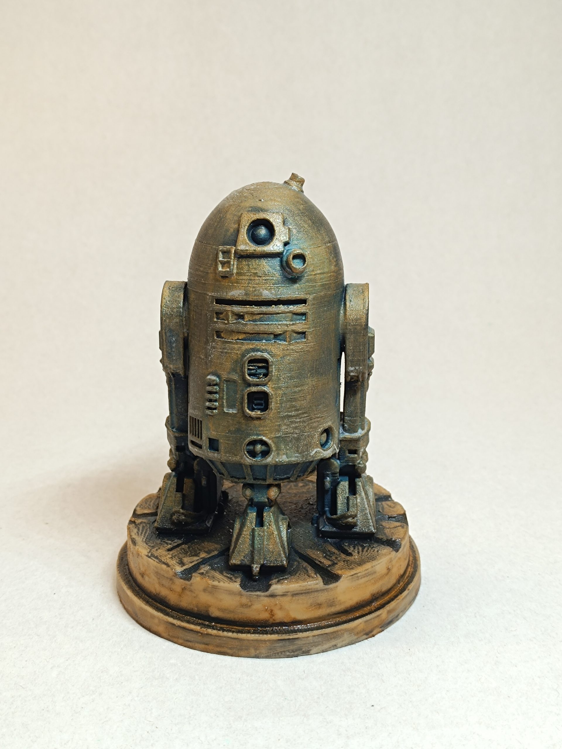 Figurine R2-D2. Finition main aspect bronze antique et métal vieilli. Impression 3D (PLA). Poids : 0,078 kg. Hauteur : 12 cm. Origine France.