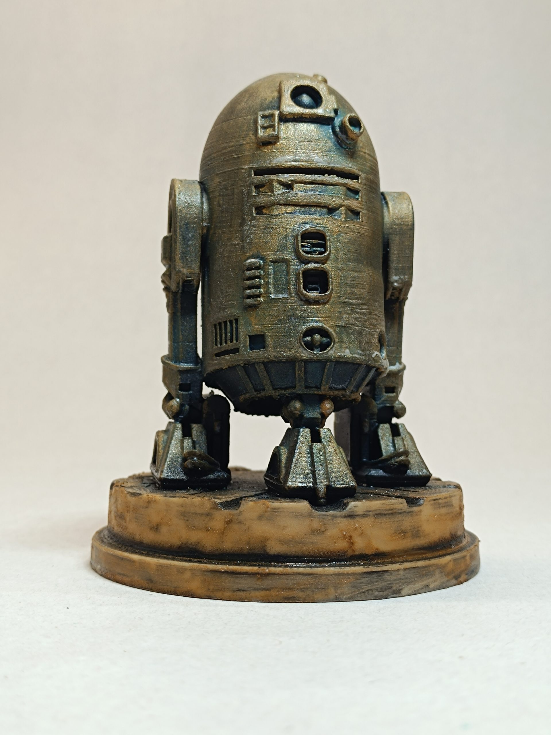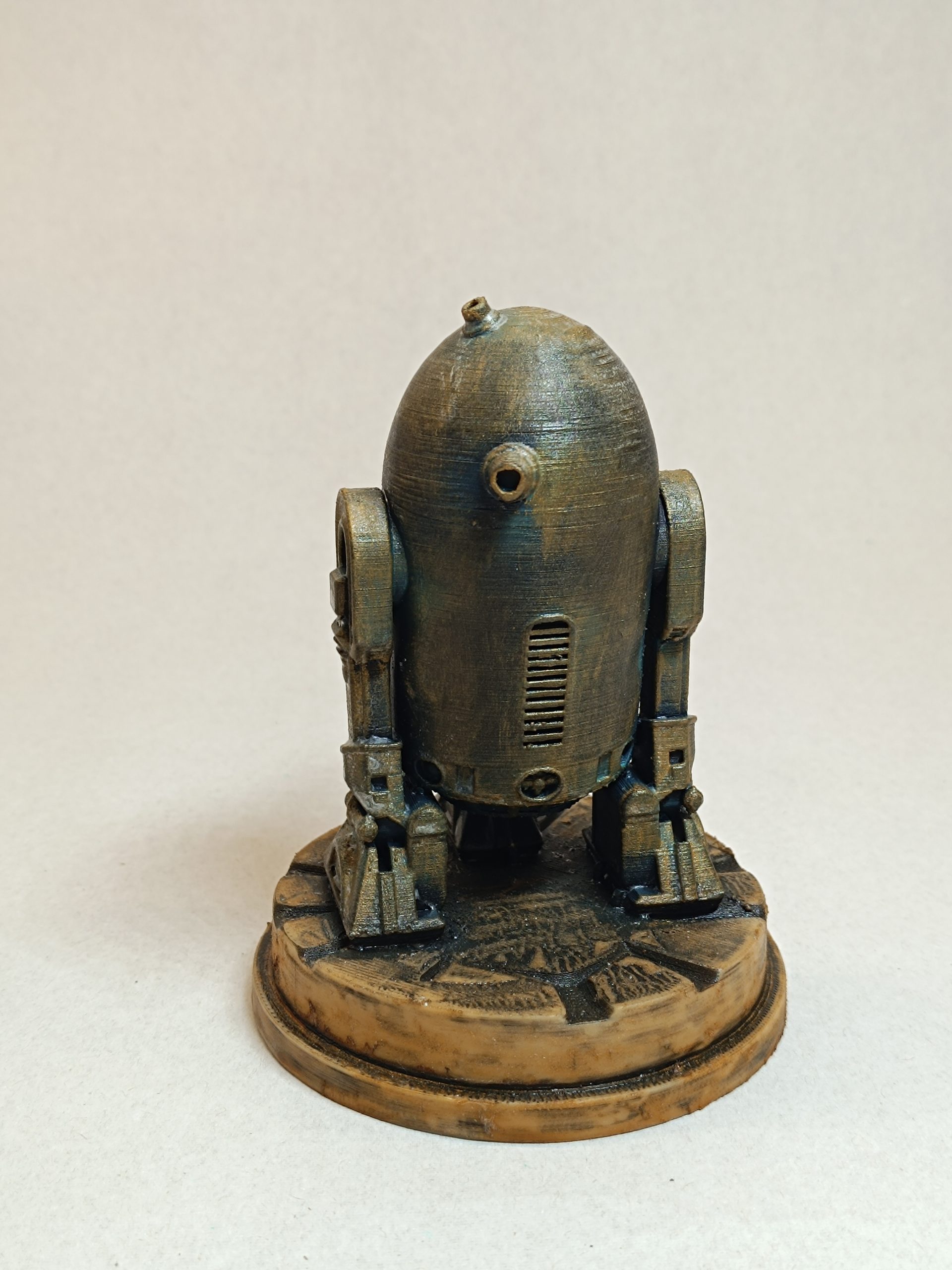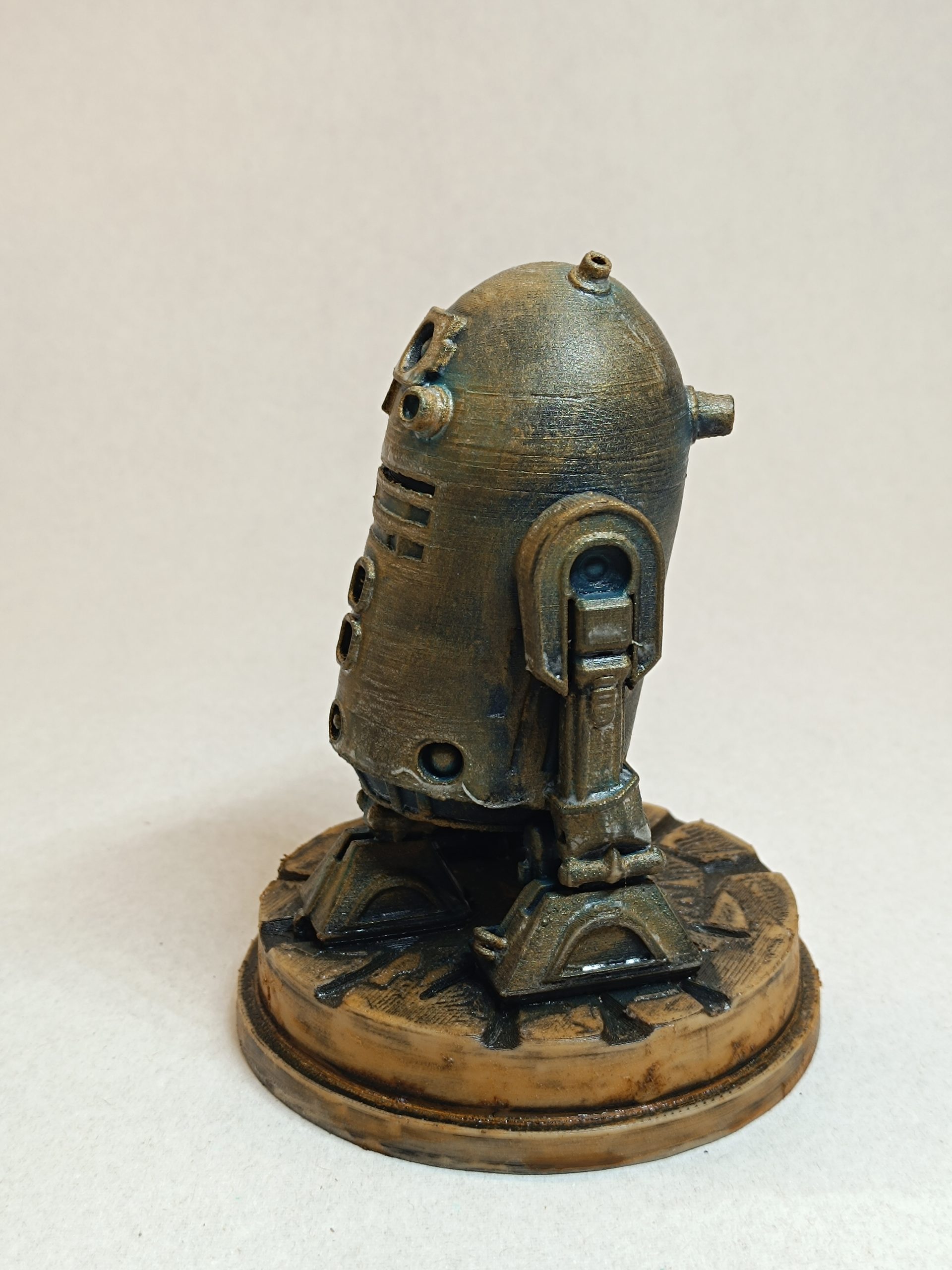 Figurine R2-D2. Finition main aspect bronze antique et métal vieilli. Impression 3D (PLA). Poids : 0,078 kg. Hauteur : 12 cm. Origine France.