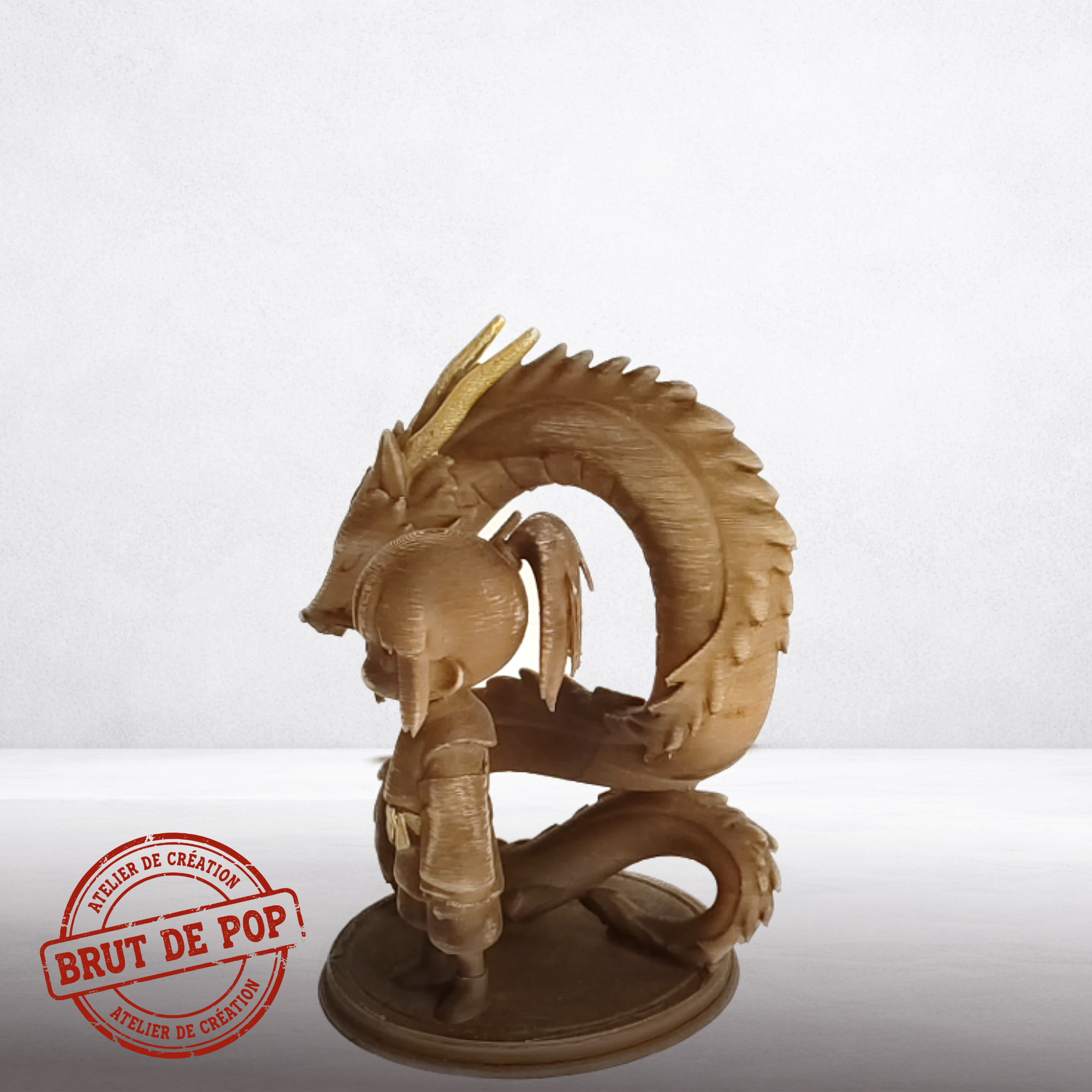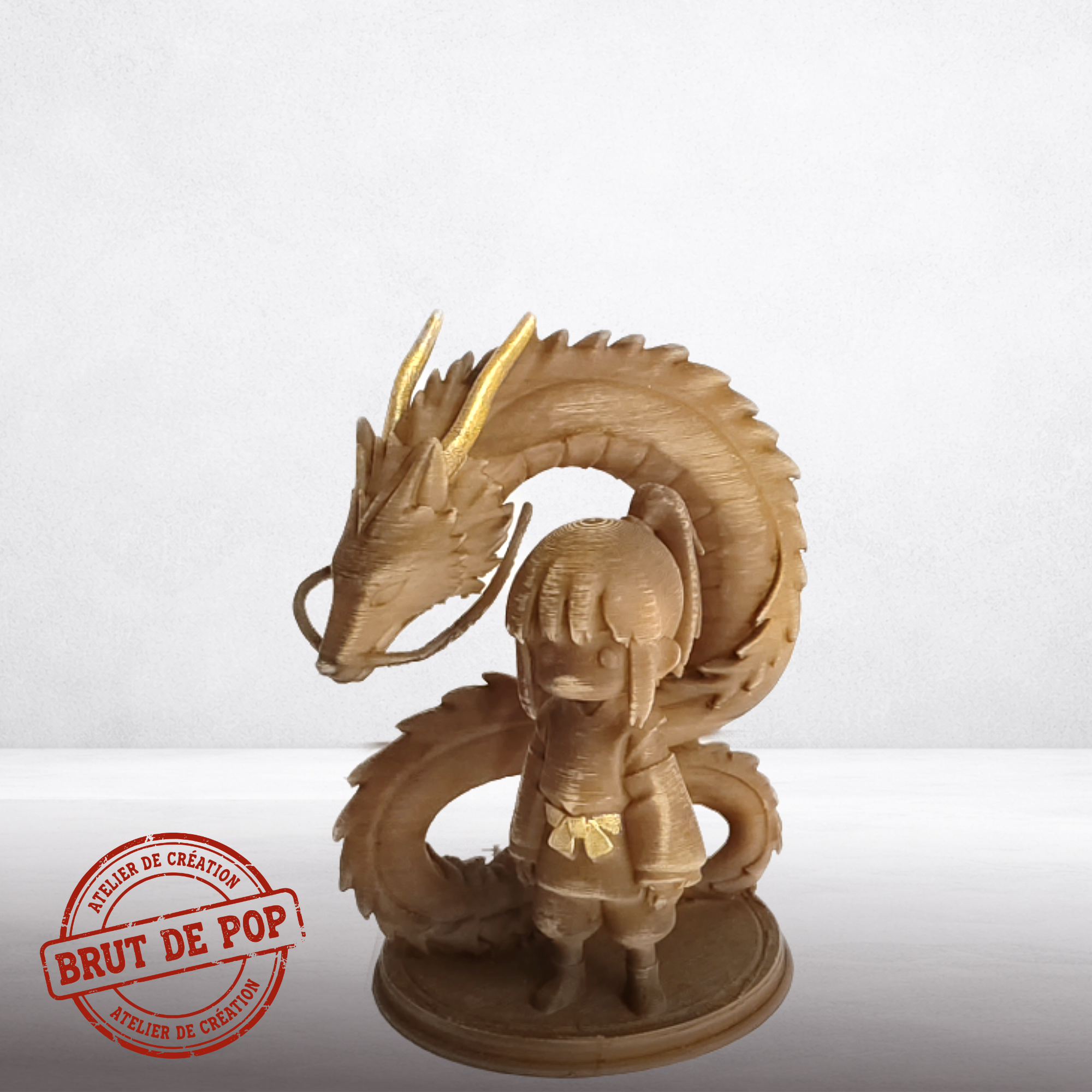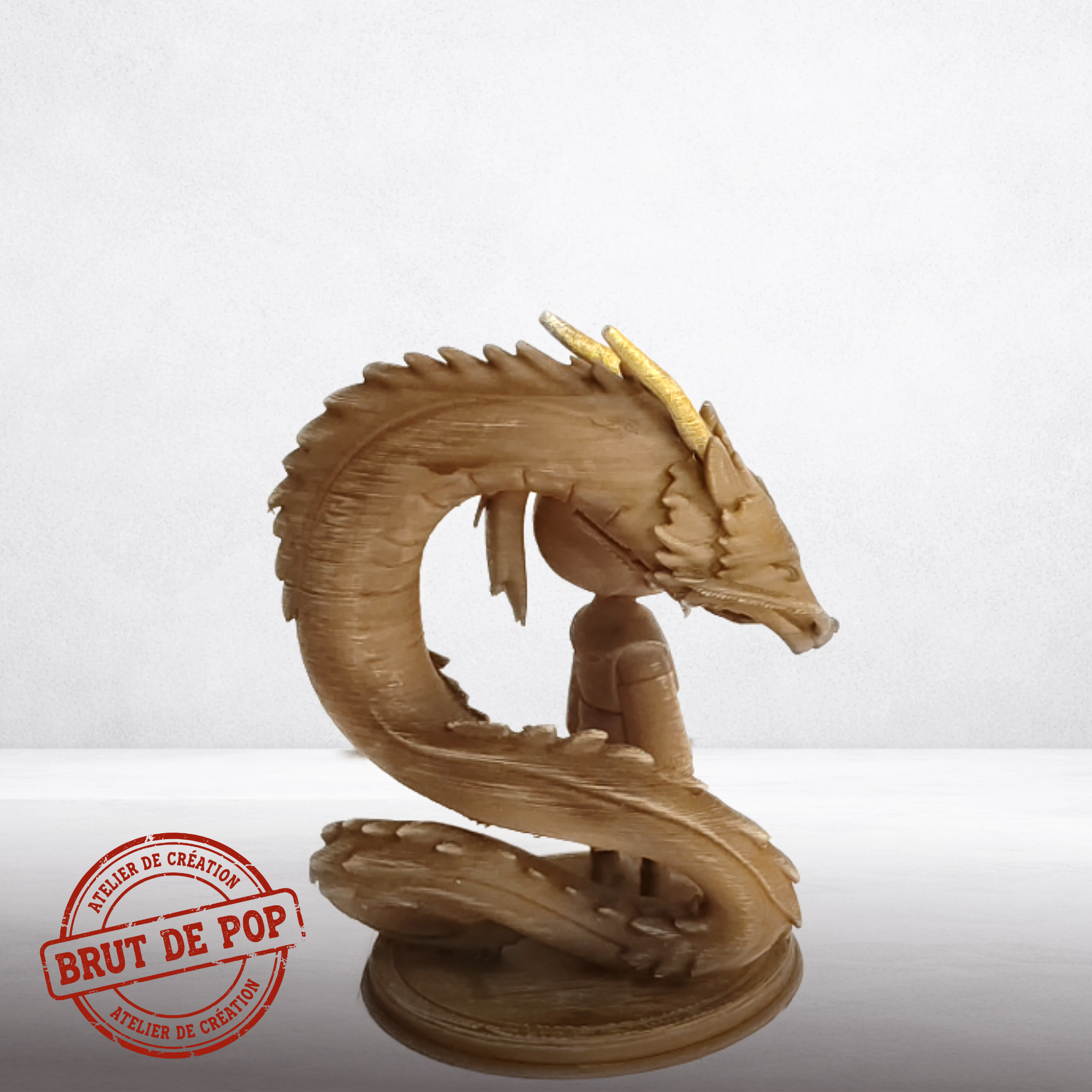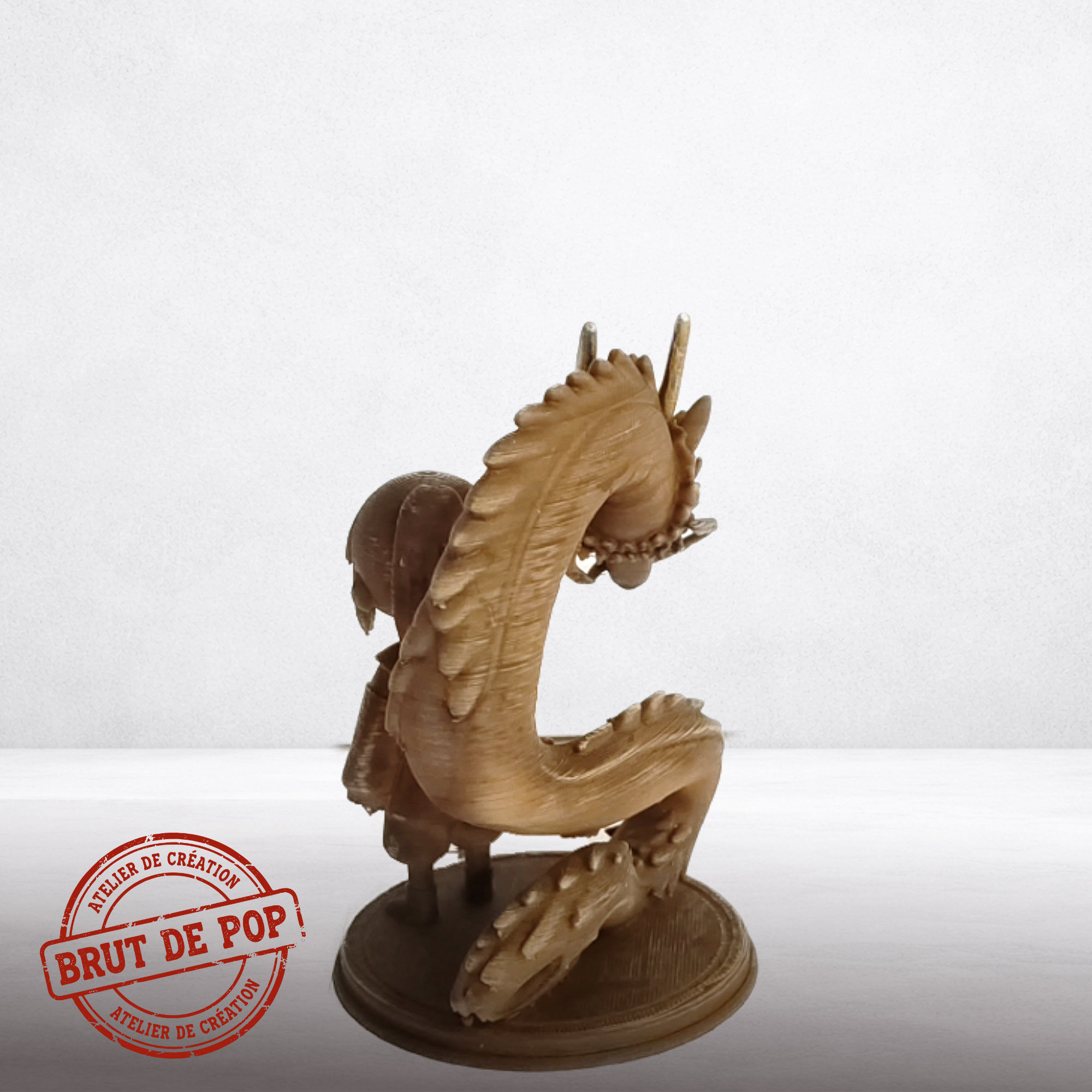 Artefact capturant le lien entre l'enfant et l'esprit dragon. Finition bois flottĂ© avec strates de fabrication additive apparentes sur les Ă©cailles du dragon et les drapĂ©s. Teinte brun nuancĂ©. L'aspect brut du matĂ©riau souligne la nature Ă©thĂ©rĂ©e et organique de l'Å“uvre.